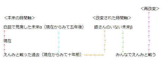 現在の銀さんが五年後(未来α)に行き、更にそこから十五年前に行き、過去を変えることによって未来を変える。